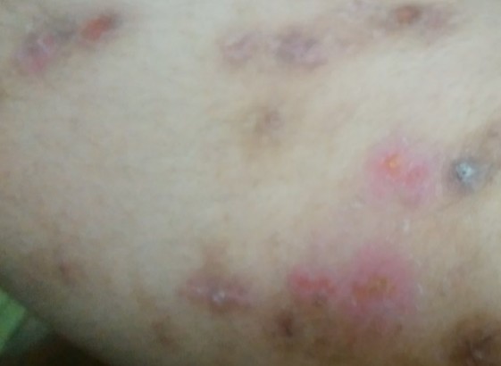 痒疹というのは、普通はポツポツと距離を置いてでることが普通だが、近いところに固まってでる場合もあって、それがつながって色んな形のカサブタみたいになるらしい。